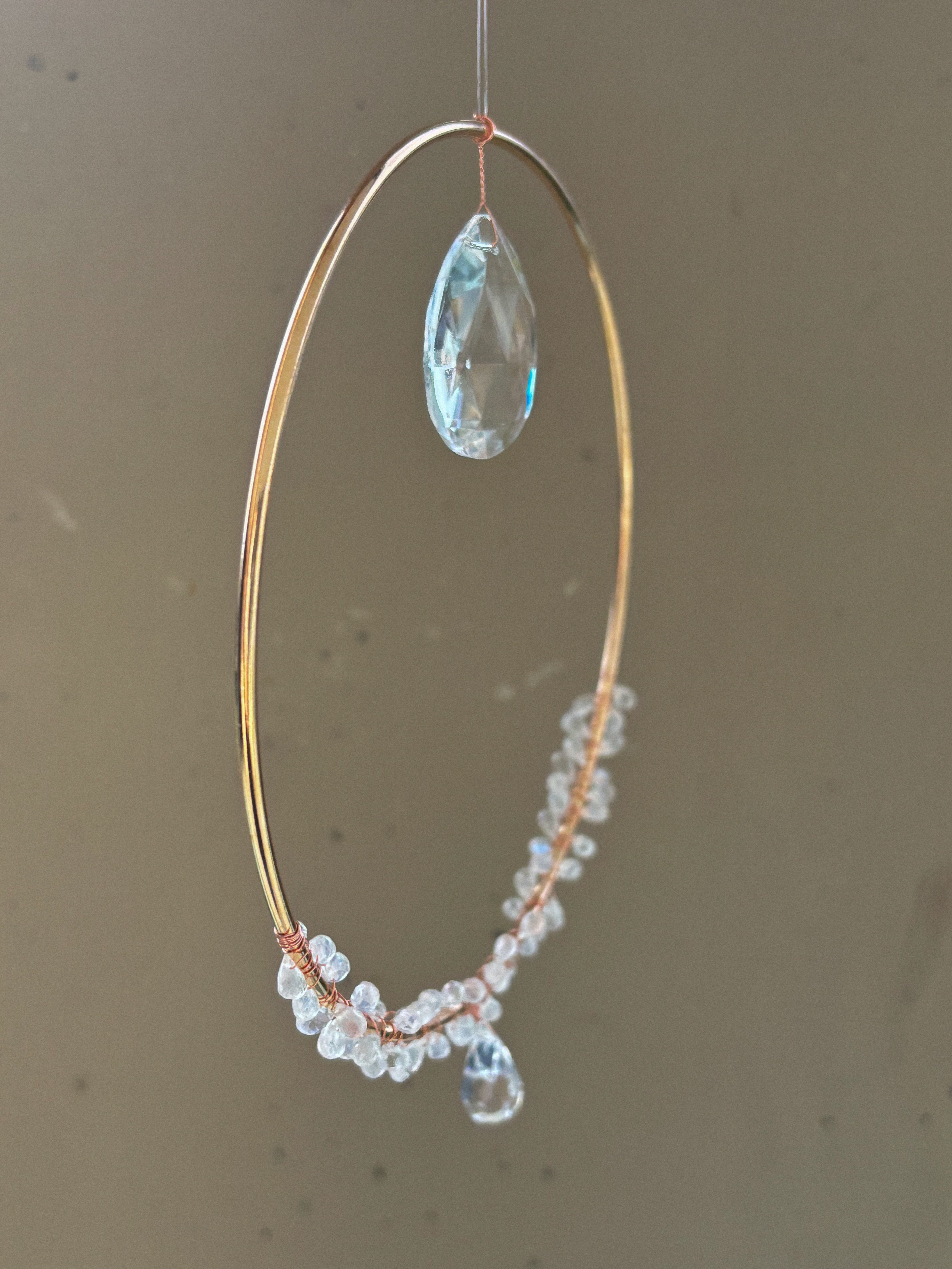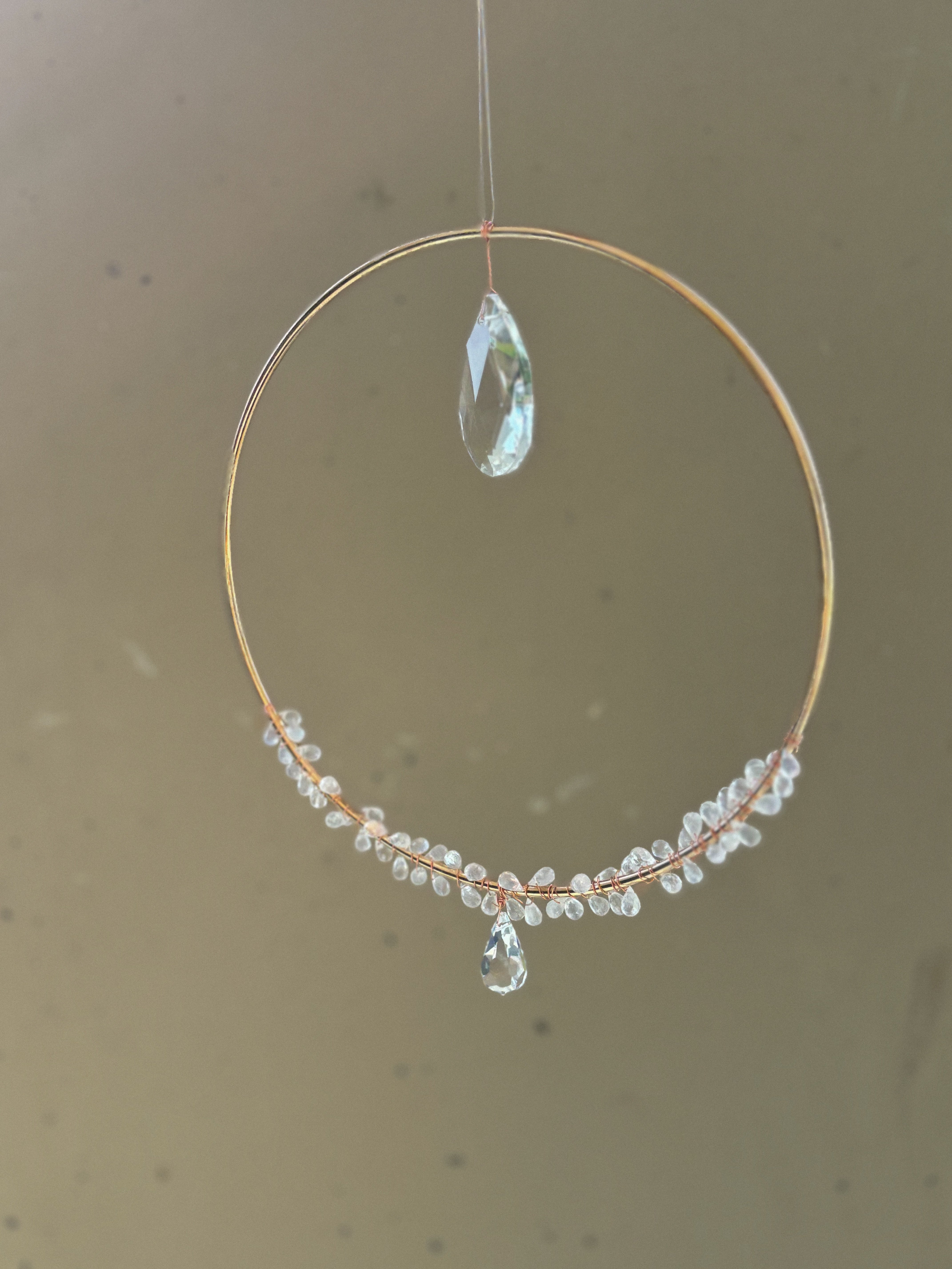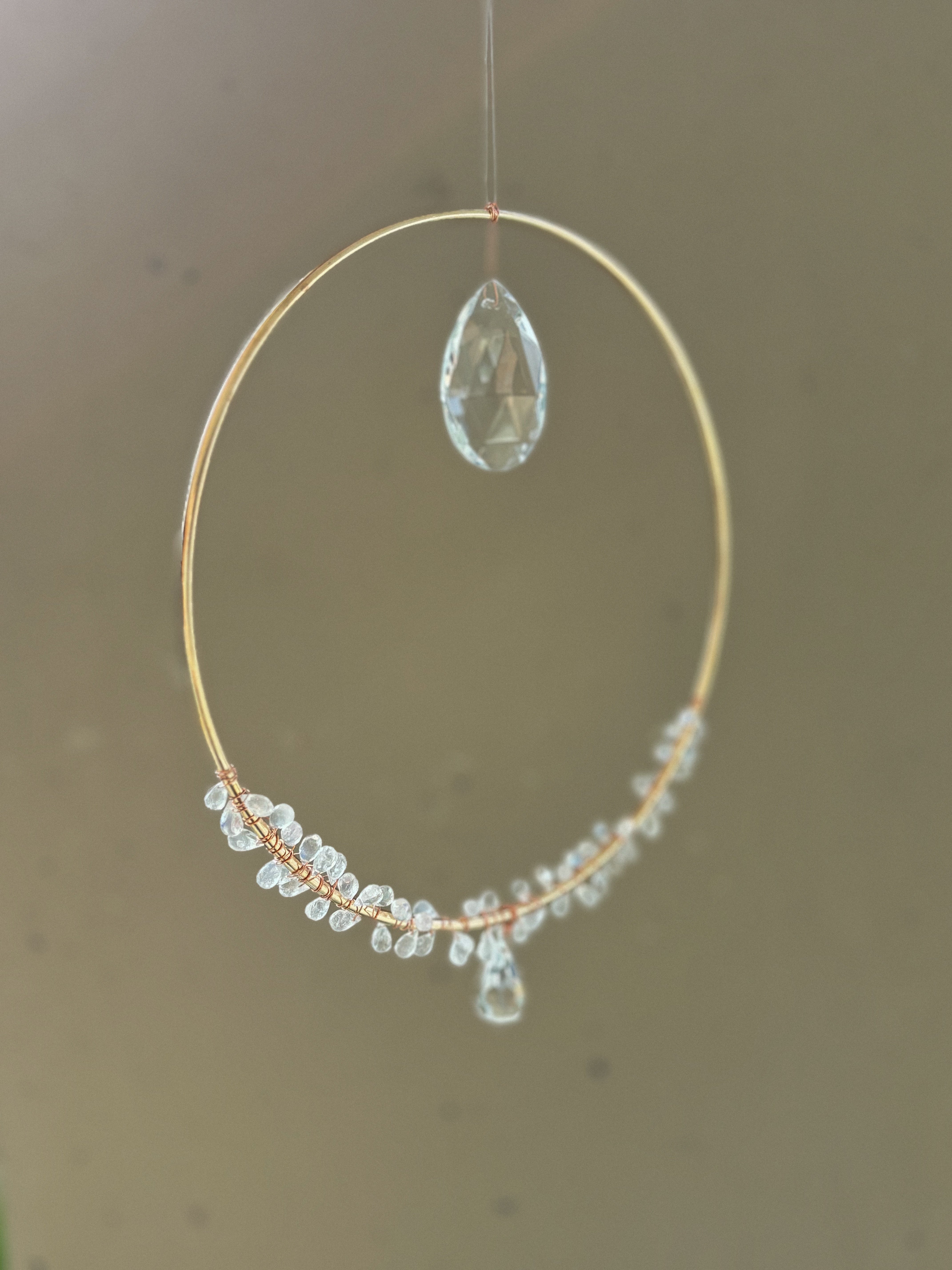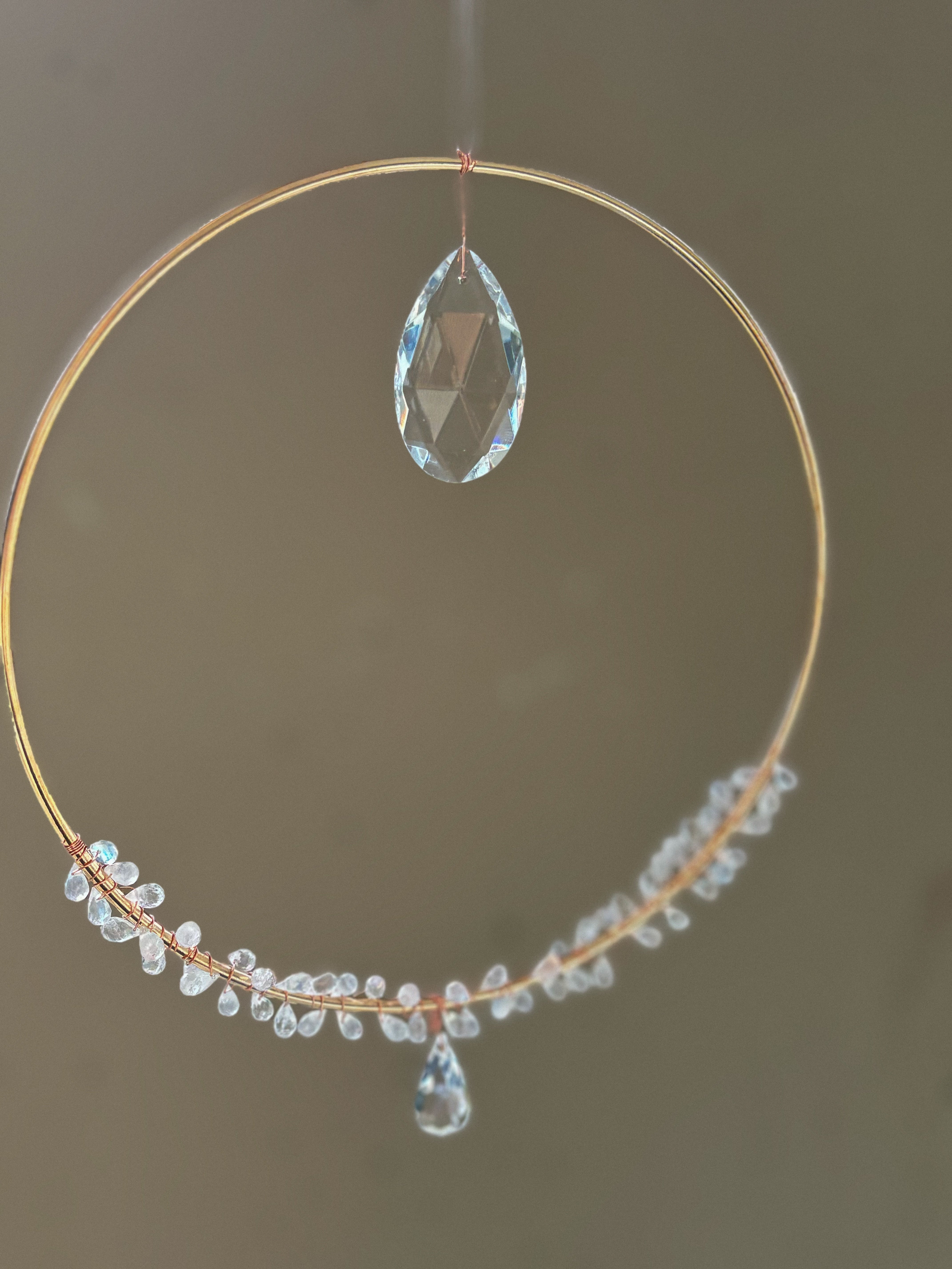 Der Suncatcher DROPS ist 13cm breit, umrandet mit kleinen Bergkristalltropfen & trägt die mandel- & tropf-förmigen Glaskristalle 38-20mm. Die Länge vom Nylonfaden kann angepasst werden.